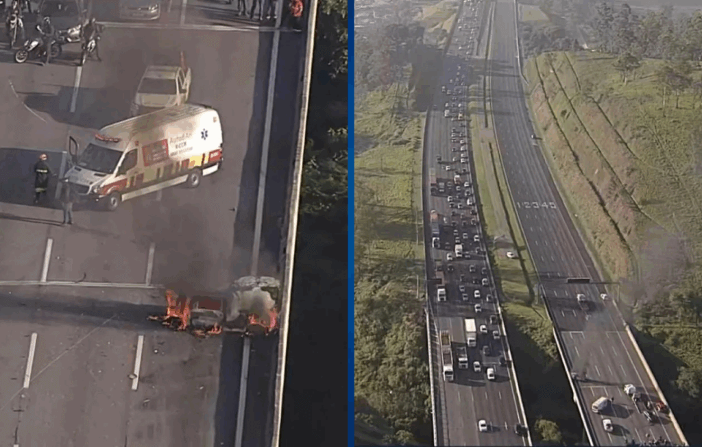 Acidente com carro em chamas bloqueia Rodovia dos Bandeirantes no sentido SP