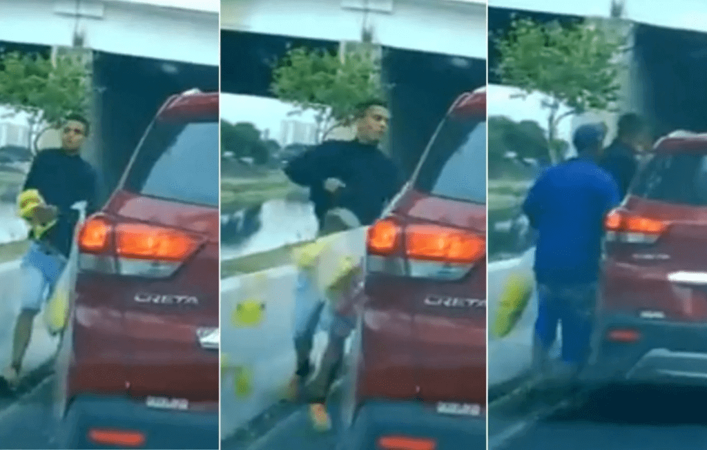 O vídeo (veja logo abaixo) mostra que os vendedores de salgadinhos vão em direção a um carro vermelho, que trafegava próximo da ponte Cruzeiro do Sul. O motorista foi forçado a parar por conta do trânsito e, com isso, um suspeito carregando sacolas com produtos se aproximou e sacou uma arma, anunciando o assalto.