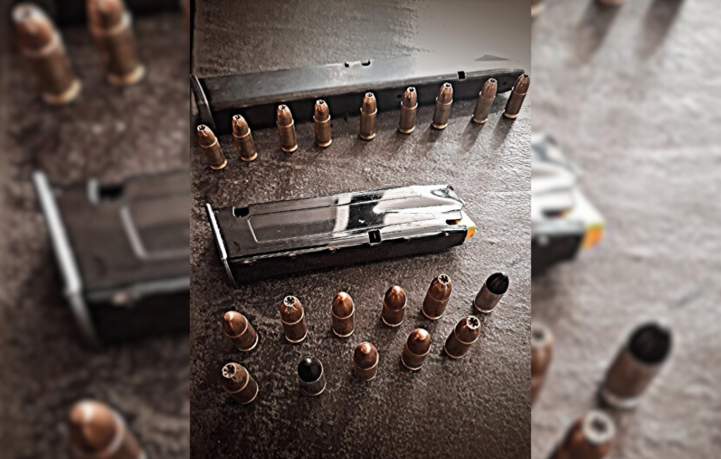 Durante a varredura, os policiais encontraram dois carregadores de pistola calibre 9 milímetros, contendo ao todo 20 munições intactas — um carregador com nove munições e outro com 11.