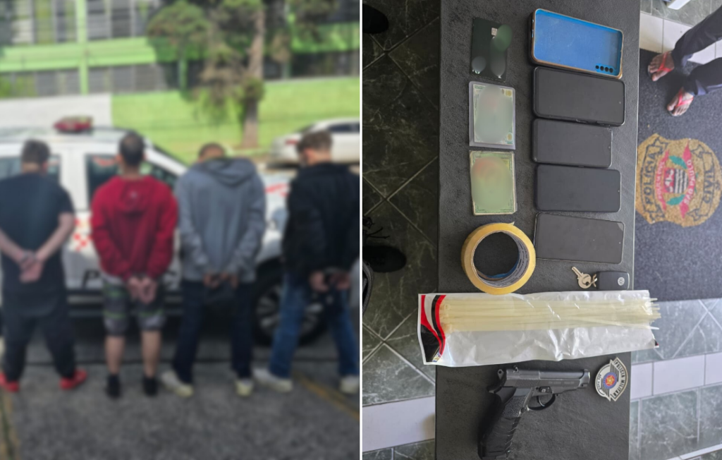 Durante a revista pessoal, nenhum objeto ilícito foi encontrado com os suspeitos. No entanto, na vistoria do veículo, os policiais localizaram um simulacro de pistola, quatro aparelhos celulares, fitas adesivas e diversos lacres plásticos do tipo “enforca-gato”, comumente utilizados para imobilização de vítimas.