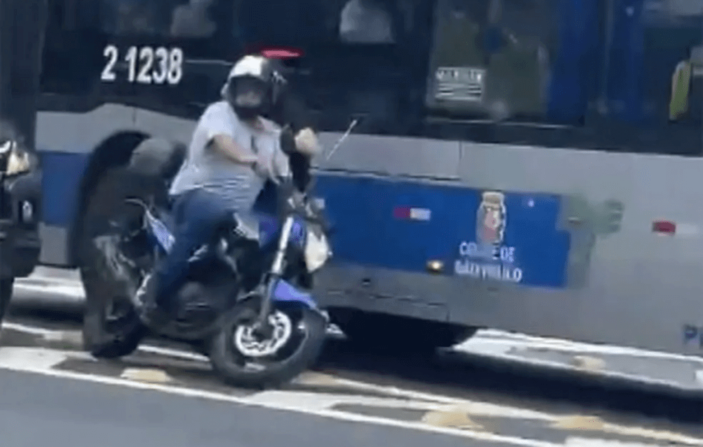 O motorista do último veículo perde o controle e, primeiro, quase atropelou duas pessoas no canteiro central da avenida. Em seguida, a viatura atingiu o casal em uma moto. Por pouco, eles não ficaram espremidos contra um ônibus.