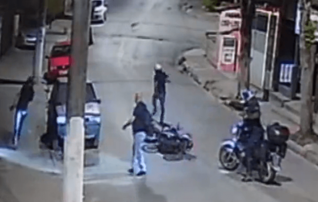 Depois de ter o celular roubado, o homem empurra os assaltantes, que caem. Neste momento surge outra moto com um guarda civil, que está com a arma em punho. Ele atira contra os criminosos, que tentam fugir.